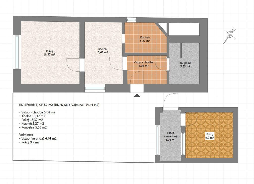 RD 2+1 a Vejminek má 1 nadzemní podlaží, CP cca 57 m2.