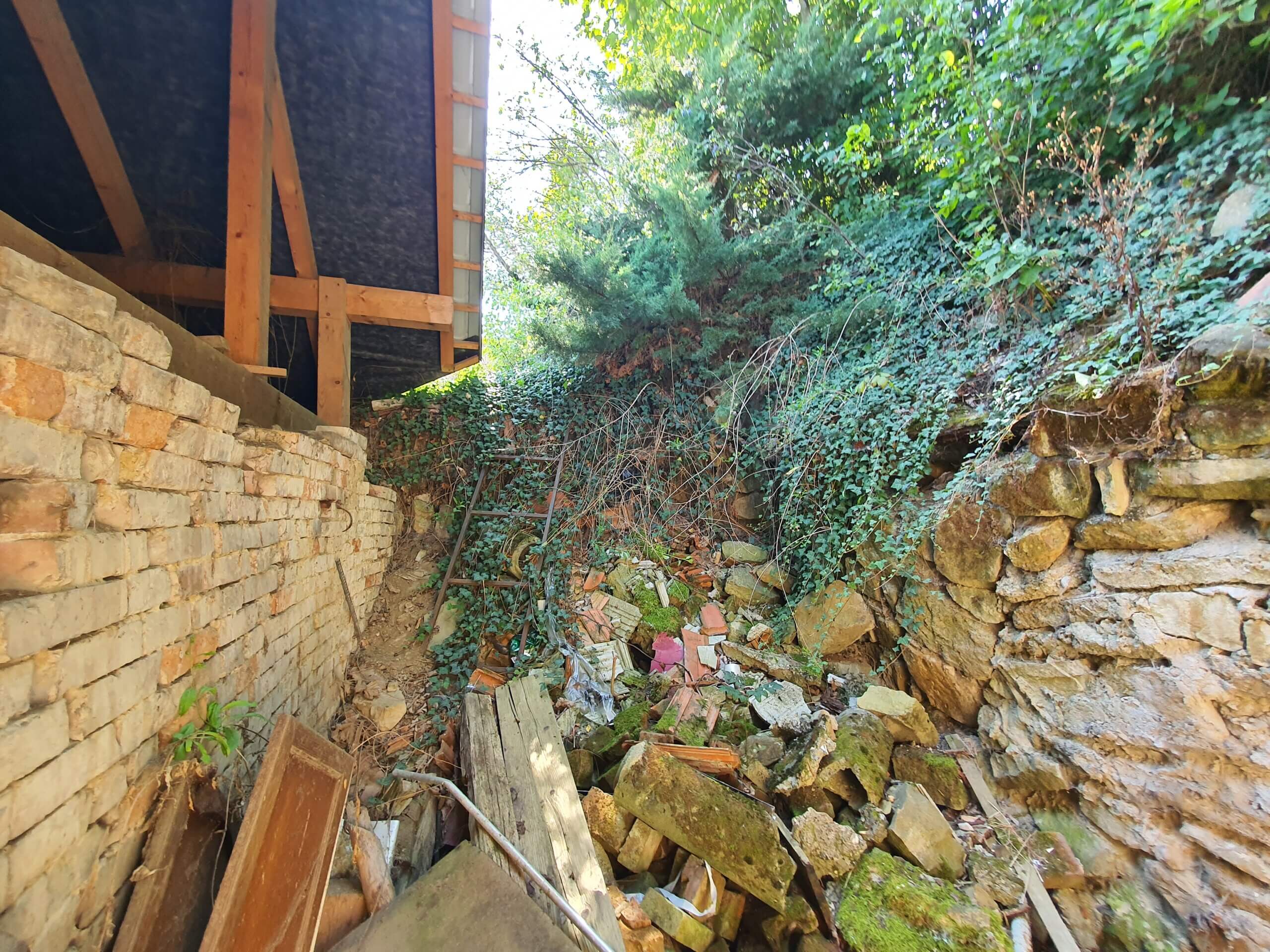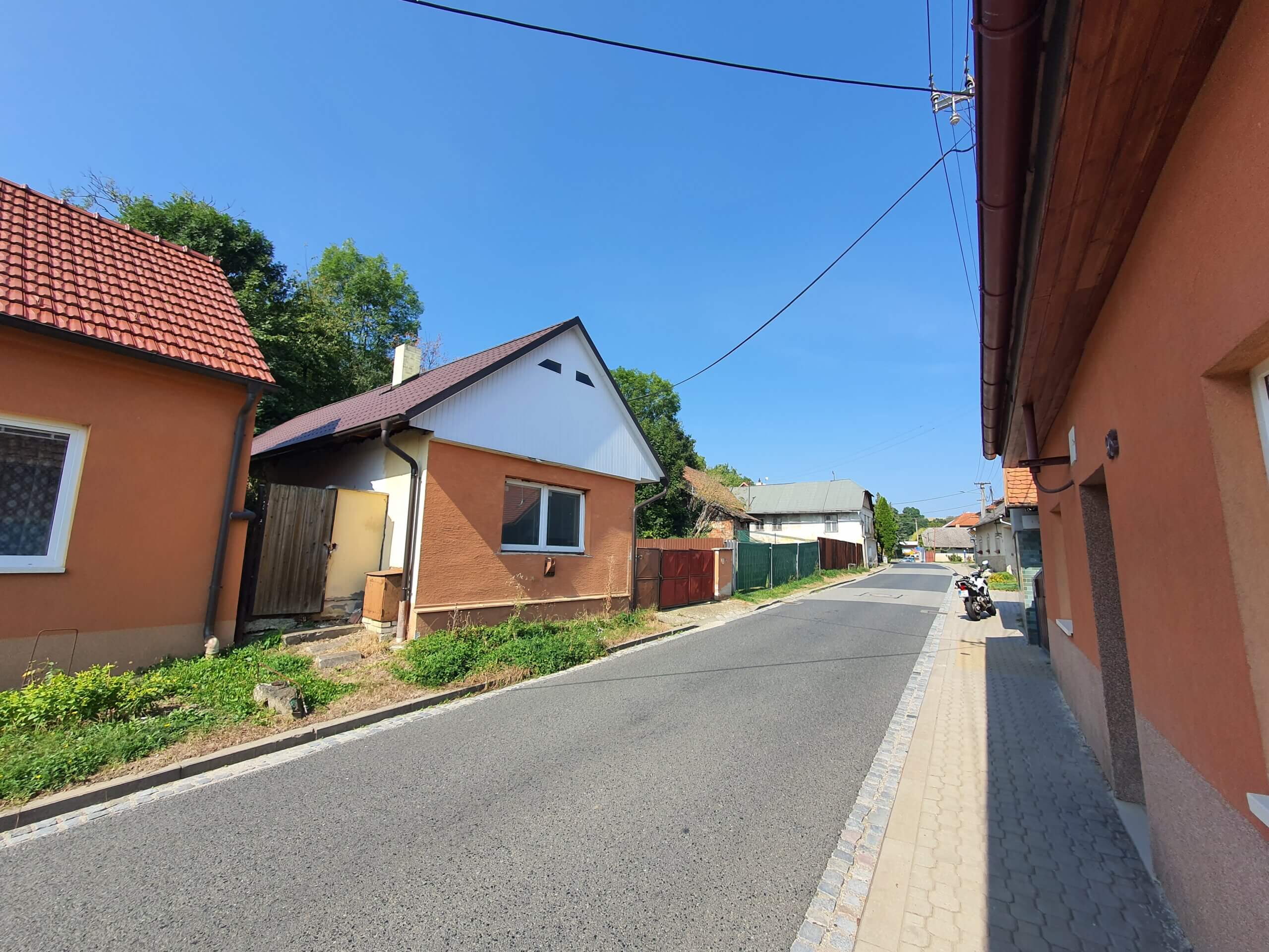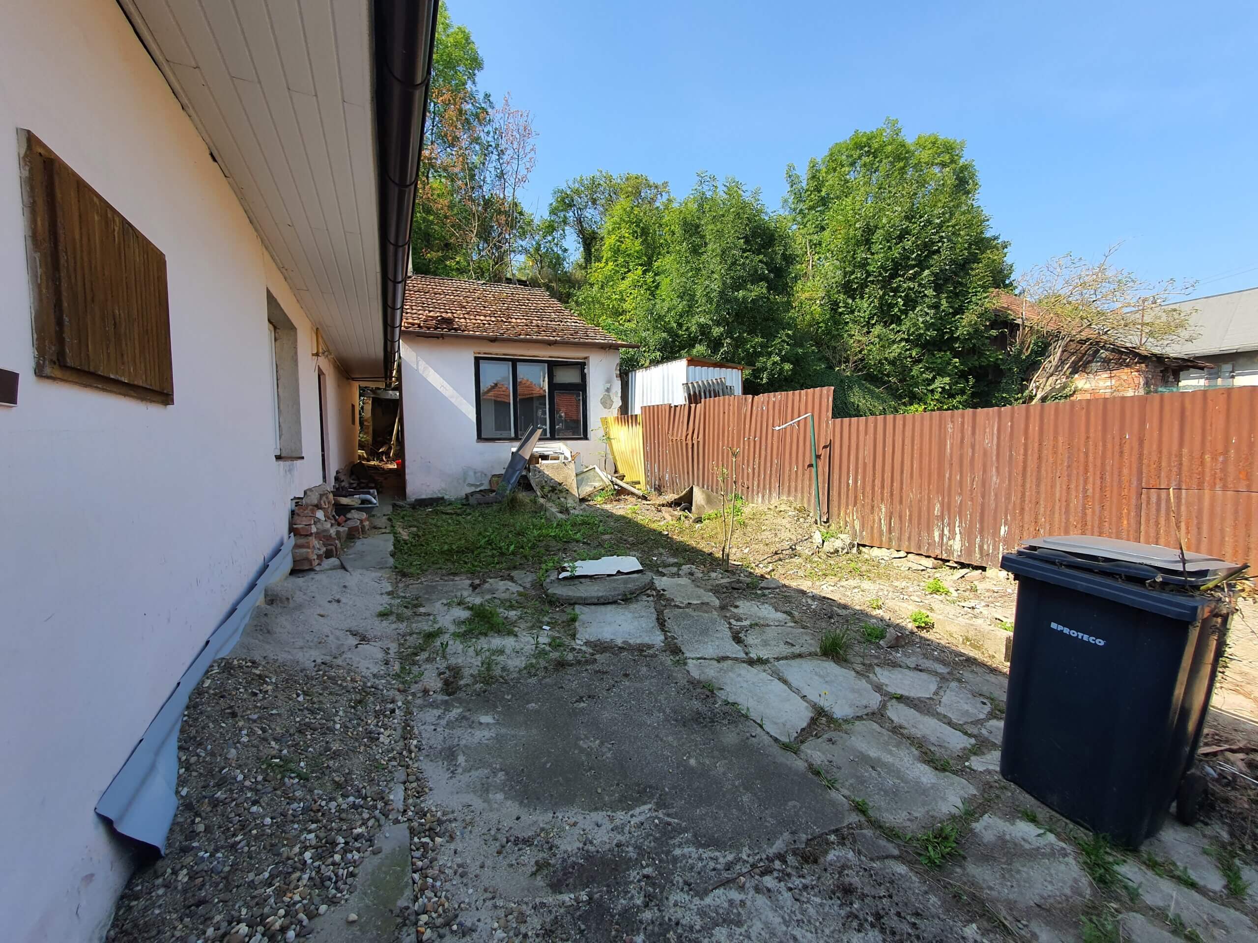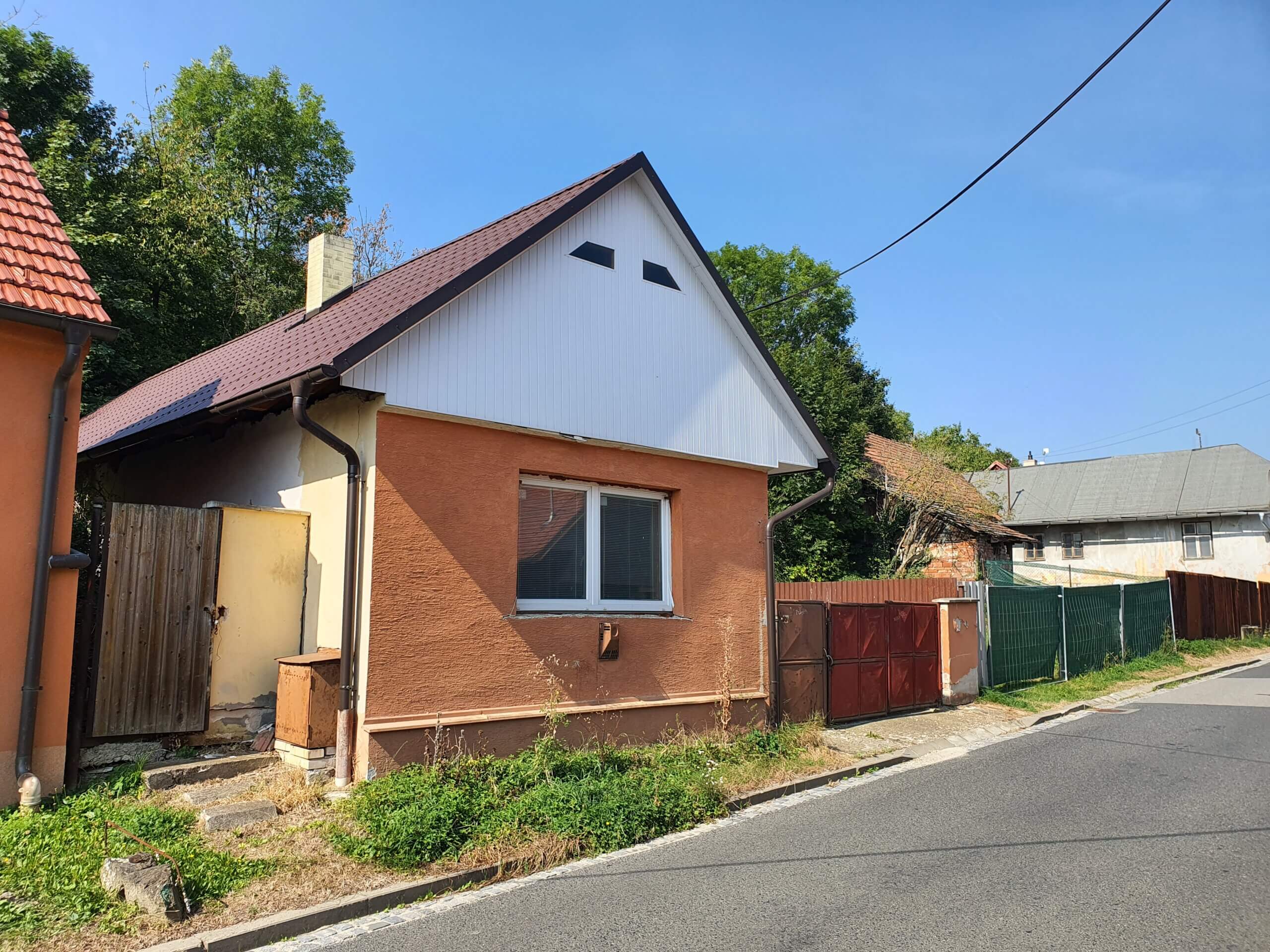 Přístup do zahrady ve svahu je brankou po levé straně od domu. Orientace oken domu je Pokoj SV (do ulice), Vstup a Jídelna SZ (do dvorku).