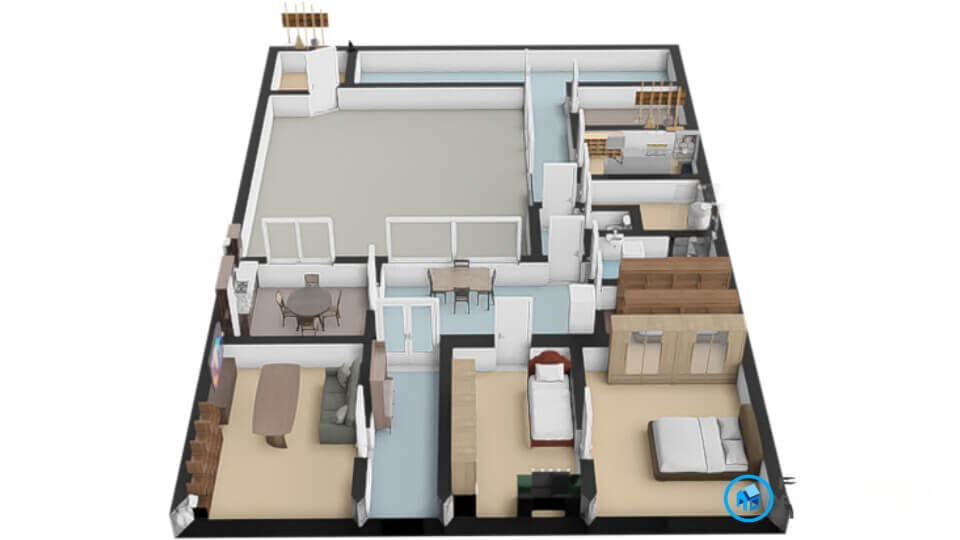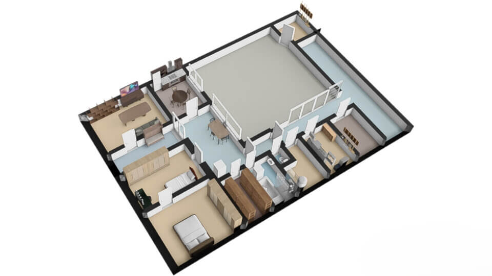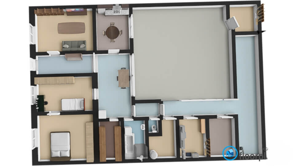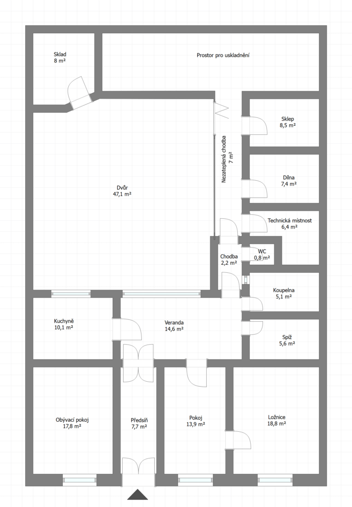 V přední části je vstup a Chodba cca 7,7 m2, z chodby se dostaneme do obývacího pokoje 17,8 m2, dále je pak možné přes verandu 14,6m2 vstoupit do kuchyně 10m2, koupelny 5,1m2, špajzy 5,6m2 a průchozího pokoje 13,9m2, ze kterého se dostaneme až do ložnice 18,8m2. Zároveň je možné z verandy vstoupit do zádveří 2,2m2 a na wc 0,8m2. Po průchodu ze zádveří se dostaneme do nezateplené části 7m2, kde je vstup do technické místnosti 6,4m2, do dílny 7,4m2 a do sklepa 8,5m2. Dále pak již navazuje vstup do dvora a skladovacích prostor odkud je možné vstoupit do prostor střechy, kde je možné skladovat věci.